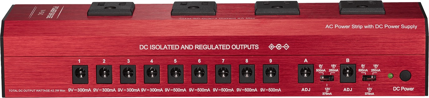 9V固定出力は、最大300mAが4ポート、最大500mAが5ポートと、アナログペダルとデジタルペダルが混在した状況でも充分な容量を確保。また、ビンテージタイプやマルチエフェクター、さらにはプリアンプにも対応する、9V/12V/18V 可変出力を2ポート装備しました。