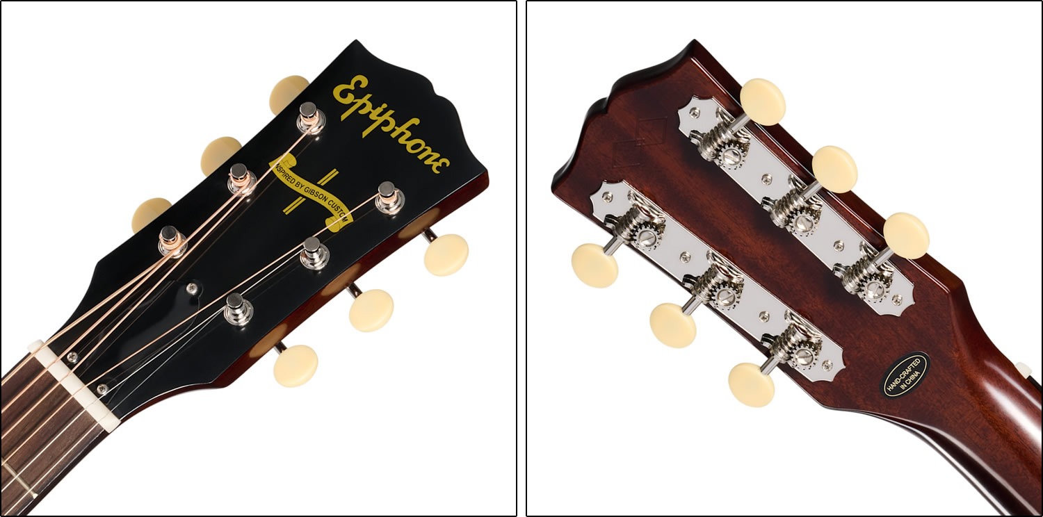 ヘッドストックはギブソンの“オープンブック”シェイプを採用。裏面にはInspired by Gibson Customのダブル・ダイヤモンド・ロゴが刻まれ、表面にはエピフォンロゴと「Epiphone Inspired by Gibson」バナーがゴールドのシルクスクリーンであしらわれています。