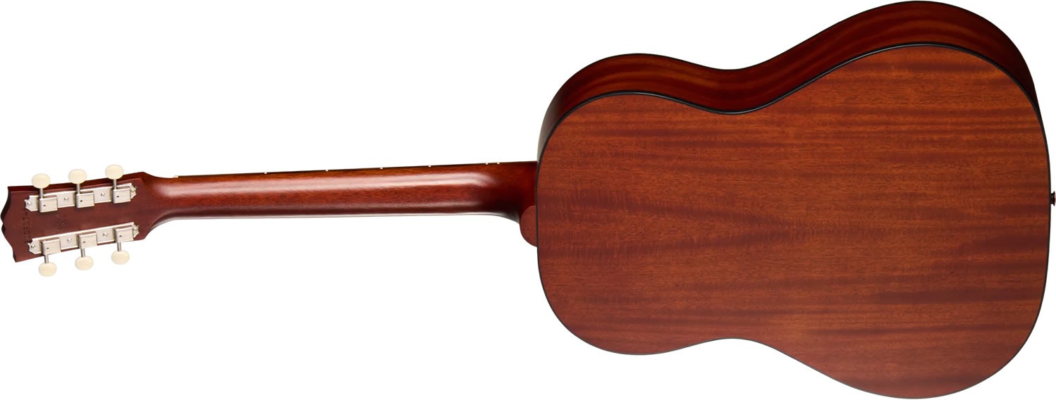 LG-2 All-Mahogany Faded は、バックとサイド、そしてサウンドボードに至るまで、ソリッド・マホガニーを使用して構築されています。マホガニー・トップは伝統的なスキャロップドXブレーシングで補強され、ボディにはトップとバックにシンプルなブラックのバインディングが施されています。マホガニー材でラウンド・プロファイルを持つネックはコンパウンド・ダヴテイル・ジョイントによりボディにセットされています。