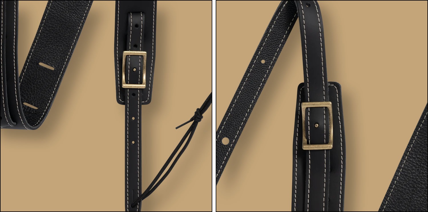 両端に調整可能な「テール」構造を採用することで、細かな長さ調整が可能。アンティークブラス仕上げの個性的なベルトバックル金具が、クラシカルな雰囲気を演出します。ストラップピンの無いアコースティックギターにも使用できる、ヘッドストック用ストリングが付属しています。