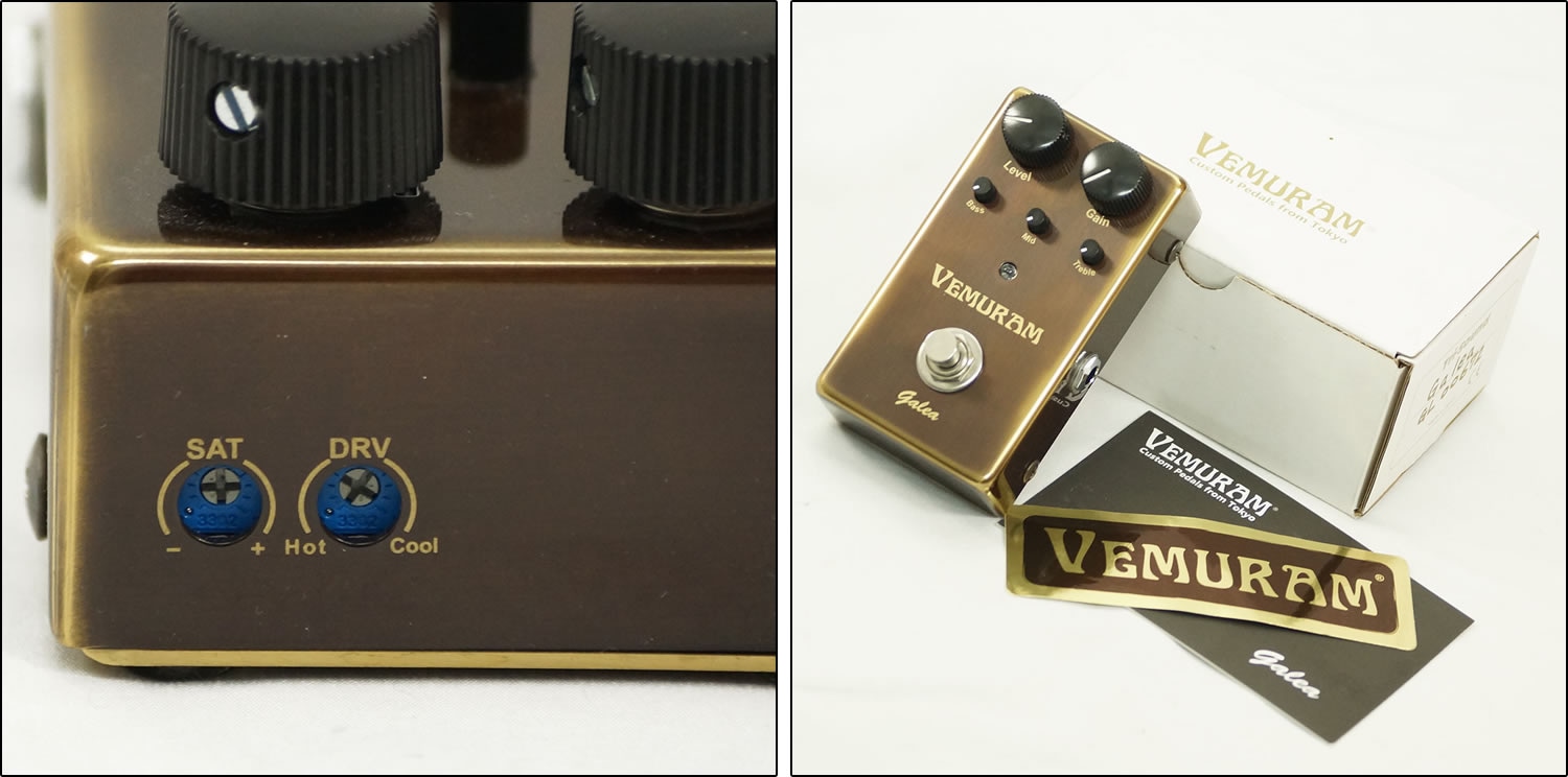 内部には SAT(サチュレーション)および DRV(ドライブ)の2系統のトリマーを搭載。SAT トリマーでは真空管アンプのような温かみと質感を、DRV トリマーでは歪み量(ゲイン)を細かく調整することが可能です。