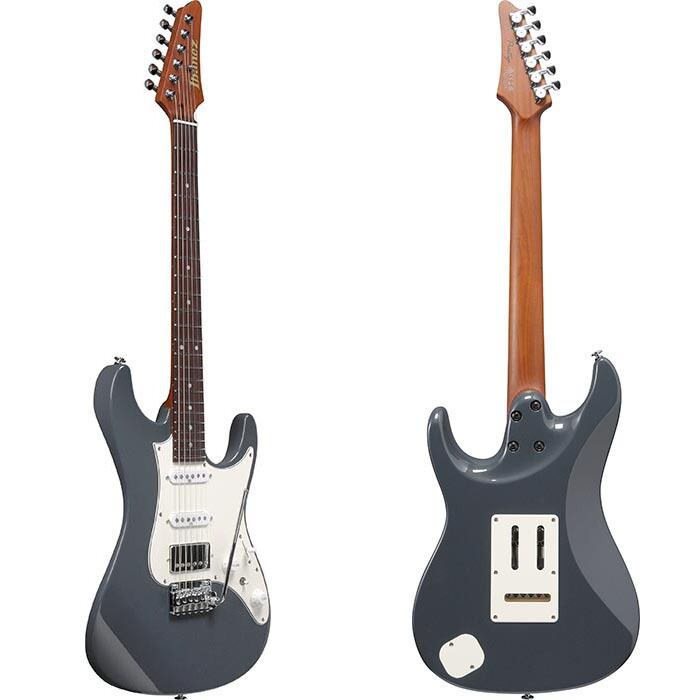 今やアイバニーズの定番となったAZの日本製モデルです。こちらは、ジャンルを選ばず、様々なシーンでオールマイティー活躍出来るスペックを誇る即戦力アイテム「Prestige AZ2204NW-GRM」。アルダー・ボディーにローステッドメイプル・ネック、ローズウッド指板、心臓部であるピックアップには、アイバニーズとセイモア・ダンカンとのコラボレーションで実現したAZ-N専用ピックアップ「Seymour Duncan® Fortuna™ pickups」をH-S-S配列で搭載しています。AZ専用「Hyperion™」と比べると、さらにナチュラルで幅広いジャンルに対応できるクリーントーン、プレイ・ニュアンスの出しやすさを求めて開発されています。ペダル・エフェクトと相性の良い中出力のピックアップで、切替えひとつで自由自在にハムバッカーとシングルコイル・モードを行き来することができる「dyna-MIX 9 switching system w/Alter switch」との組み合わせで、幅広いサウンドメイクを行う事が可能です。Alterスイッチでは、ネックとセンターのシングル・コイルを直列に配線し、22Fのネック・ハムバッカー・サウンドをシミュレートしています。また、ブリッジにはIbanezとGotoh®とのコラボレーションで誕生したブラス製サドル&イナーシャ・ブロック採用「Gotoh® T1702B tremolo bridge」を搭載し、ウォームでブライトな音色とレゾナンスの良さやスムースなアーミングに加え、弦間ピッチは10.5mmのナロー・スペーシング設計を採用している事で、弦間をまたいだピッキングのしやすさも特徴になっています。ペグにはロック式でポスト高さを調節することが可能な「Gotoh® Magnum Lock machine heads w/H.A.P.」を採用。更に、コンパウンド・ラディアス指板や、5本掛けスプリング(ゴム製スプリング・ミュート装備)の採用など、細部に渡って拘りが詰め込まれ、まさに、圧倒的プレイヤビリティと幅広いサウンドヴァリエーションを誇る、隙のない1本です。