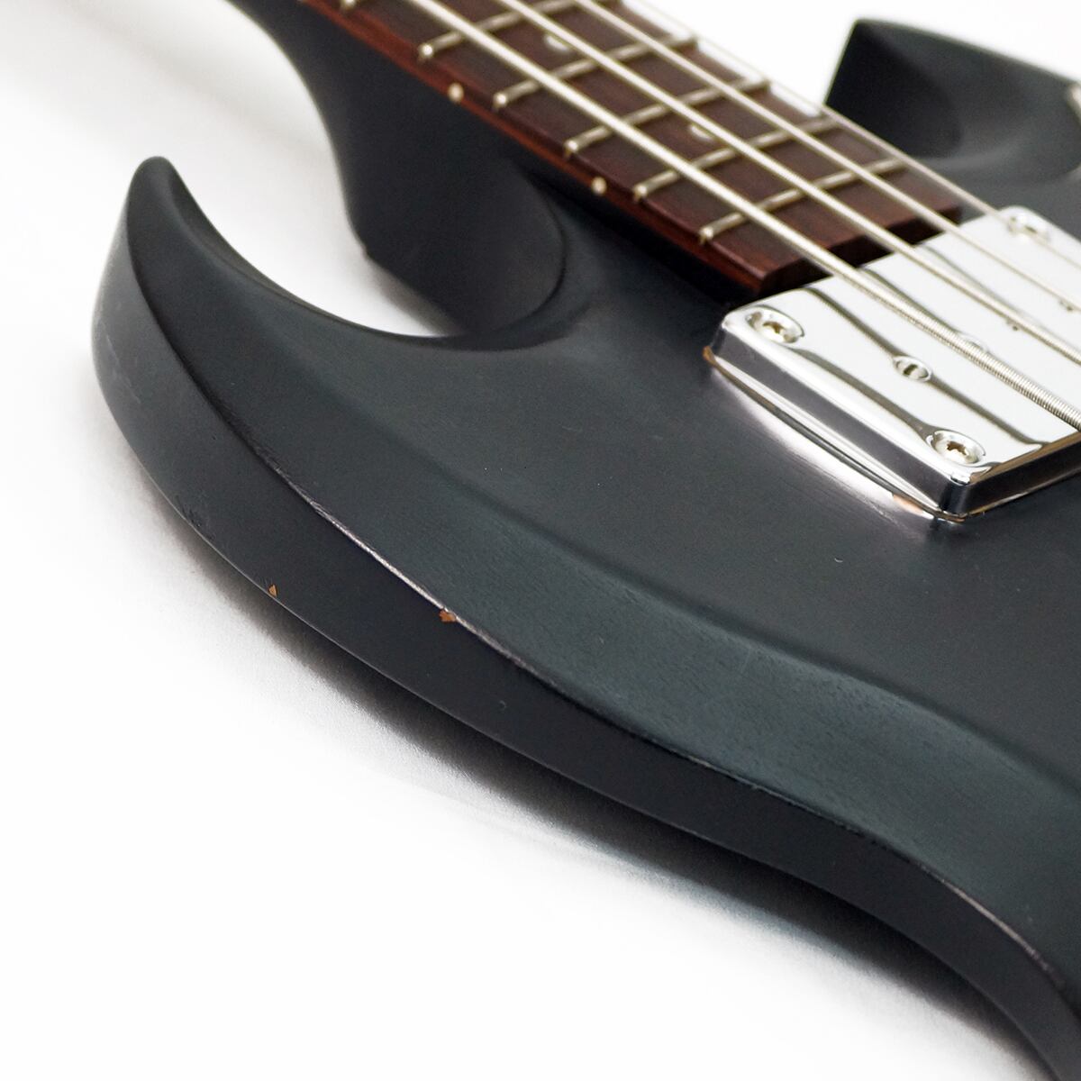 王道のSGベースを基本に、弾き込めば弾き込むほど味わいの出るWornフィニッシュ(艶消し)を採用し、精悍な印象のルックスが印象的な一本です。30.5インチ・ショートスケールによる圧倒的な弾き易さは勿論、マホガニーBODY&NECKに独特のピックアップの組み合わせによって、って、オリジナリティ溢れるサウンドも魅力です。