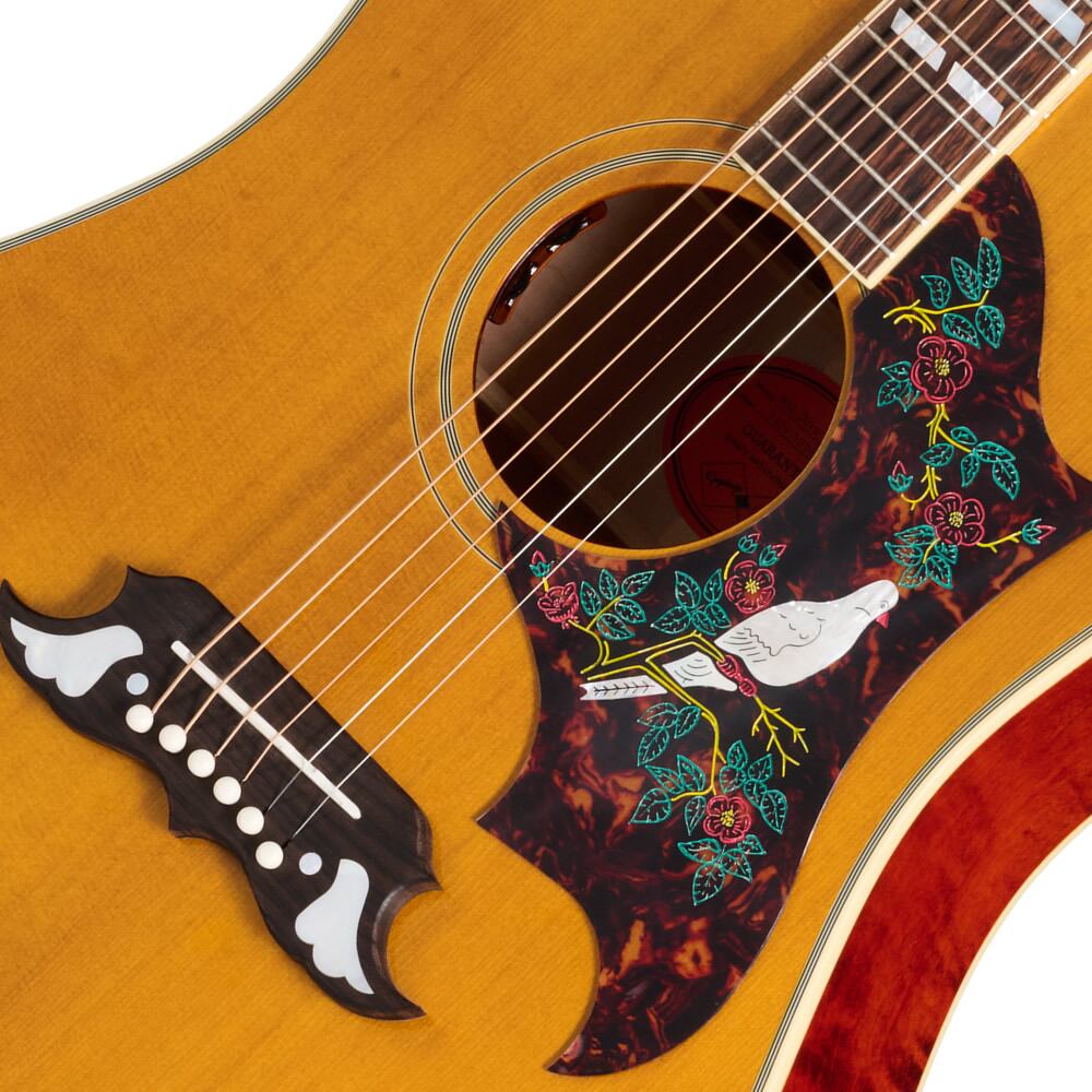 1962年にギブソンの2作目のスクエアショルダー・アコースティックモデルとしてリリースされたGibson Dove™は、その特徴的なデザインで広く知られています。エルヴィス・プレスリー、トム・ペティ、ジョン・メレンキャンプ、アレックス・ライフソン、フランク・ハノンなど、多くの著名なプレイヤーに愛用されてきました。