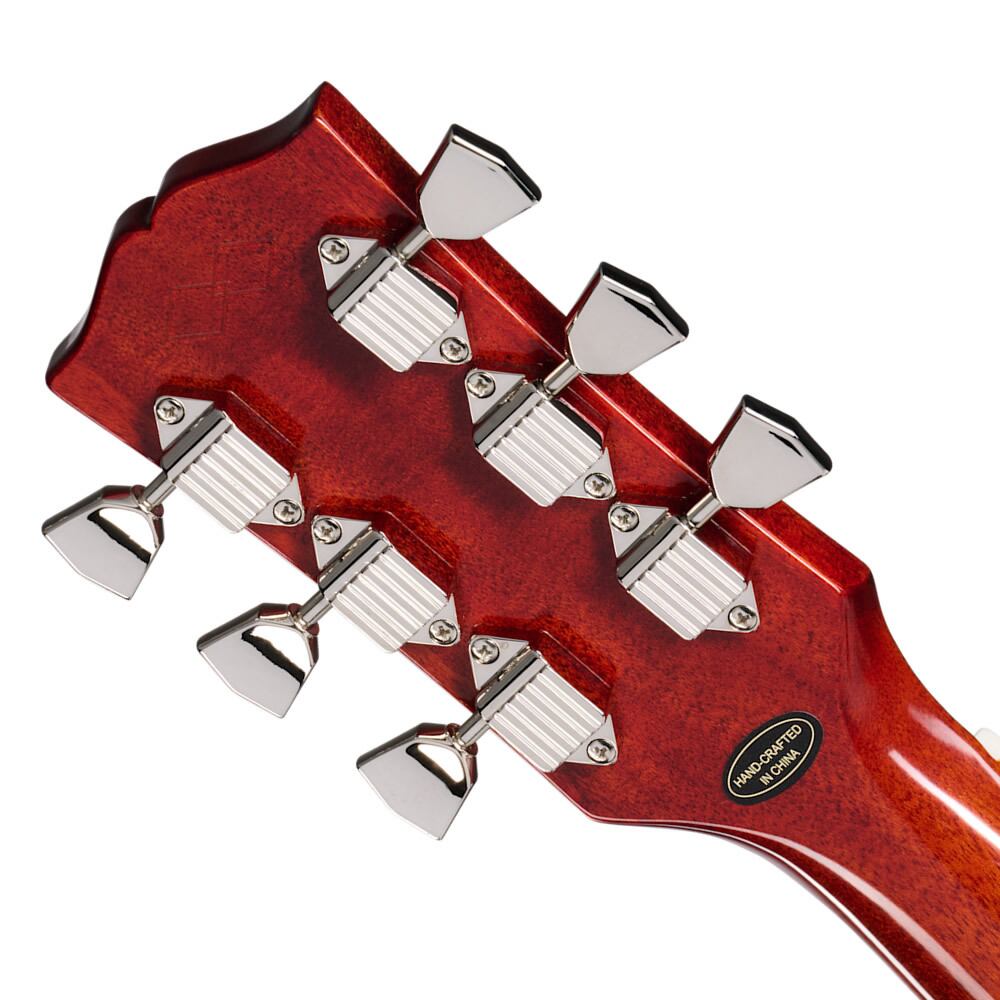 ヘッドストックについて、Kluson®のワッフルバック・チューナー(メタル製キーストーンボタン付き)を装備し、安定したチューニングを実現しています。ヘッドストックには2層のトラスロッドカバーが取り付けられ、「DOVE」の刻印が施されています。Epiphoneロゴとギブソンのクラウンインレイはエイジド・マザー・オブ・パールであしらわれています。ヘッドストック形状はギブソンと同様の“オープンブック”スタイルで、裏面にはInspired by Gibson Customのダブル・ダイヤモンド・ロゴが刻まれています。