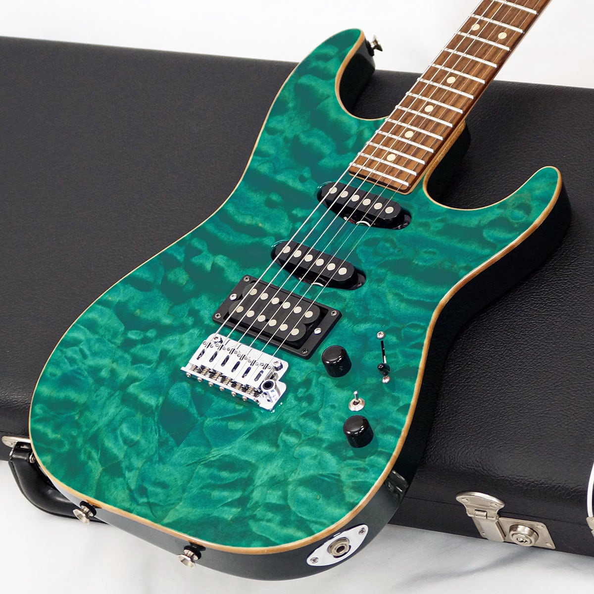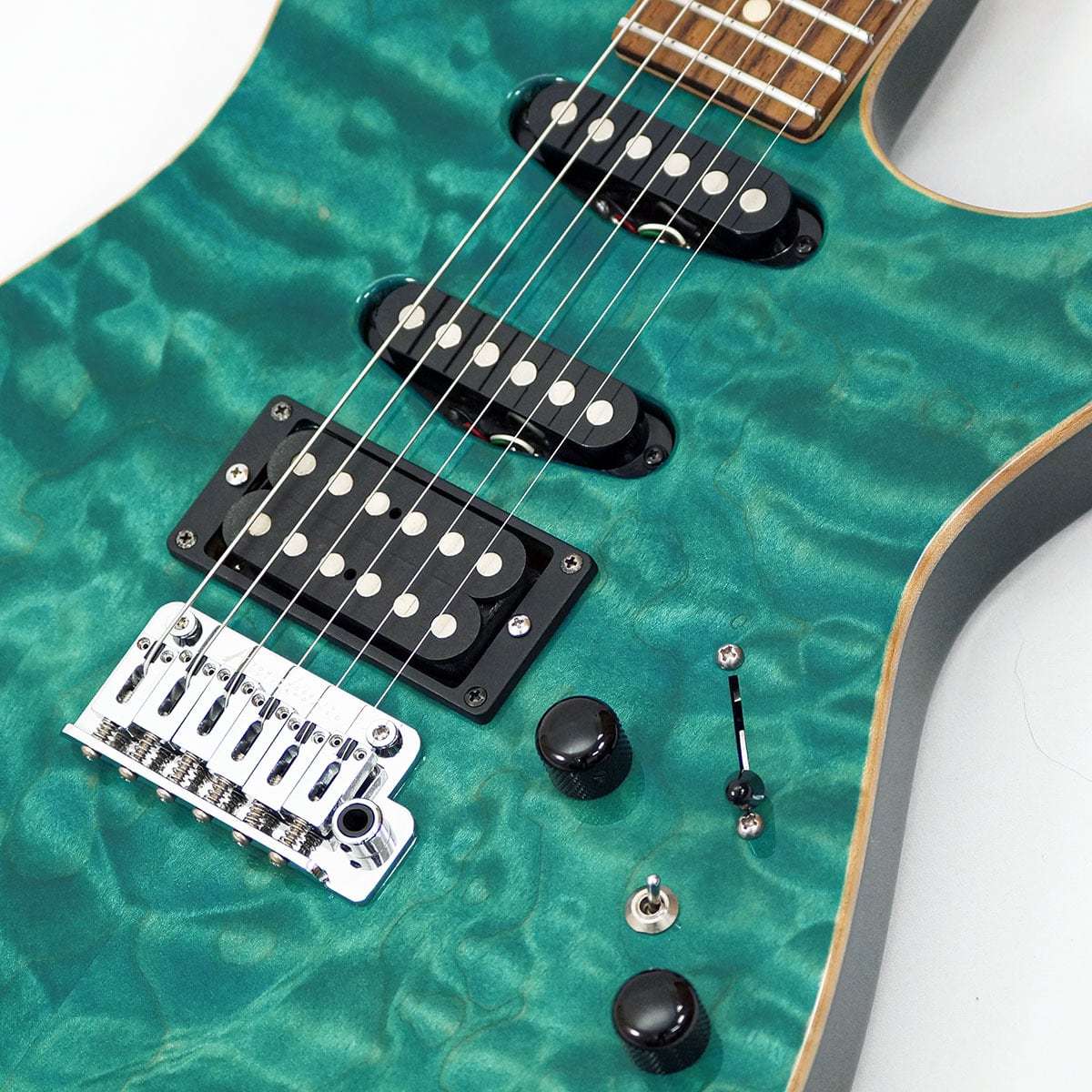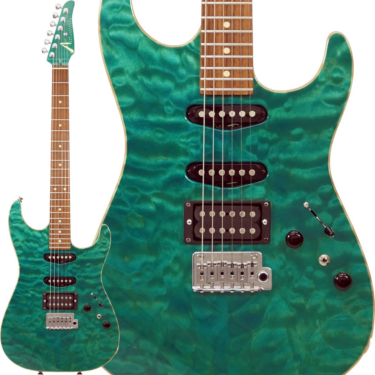 キルト・メイプル/マホガニーBODYにS-S-Hピックアップ配列(SC1 SC1 H2+ Pickups)を採用し、Bora Bora Blueのマッチングヘッドで仕上げた、非常に人気の高い仕様になっています。バズフェイトン チューニングシステムも採用し、確かなピッチ感と、クリアで濁りの無い和音を実現してくれます。