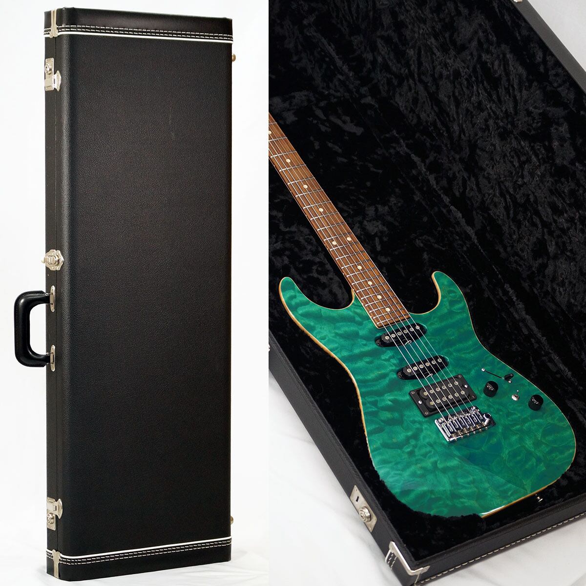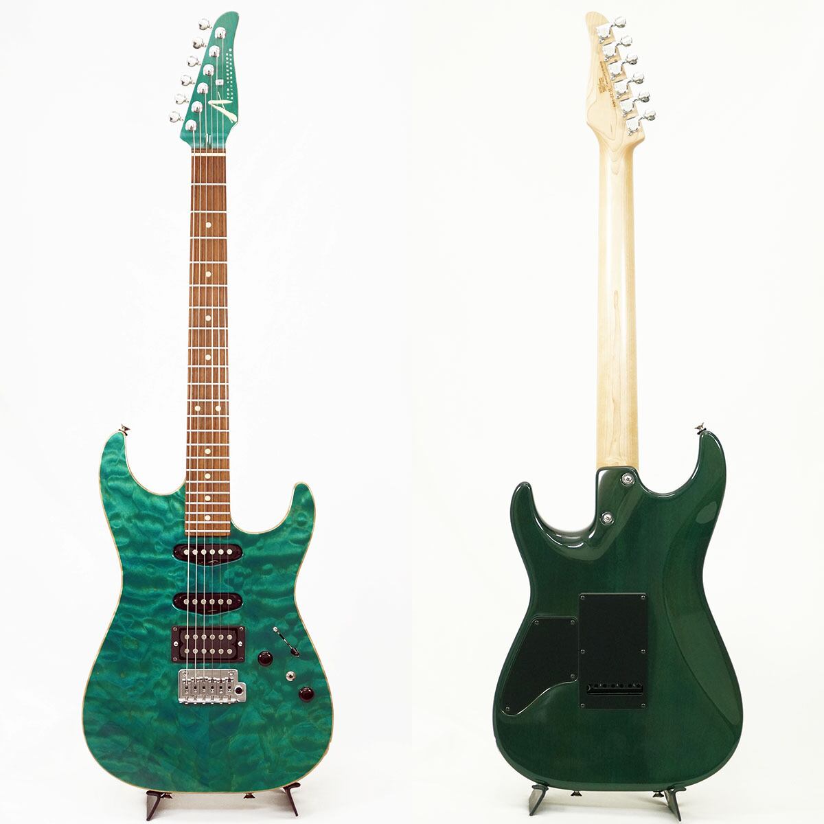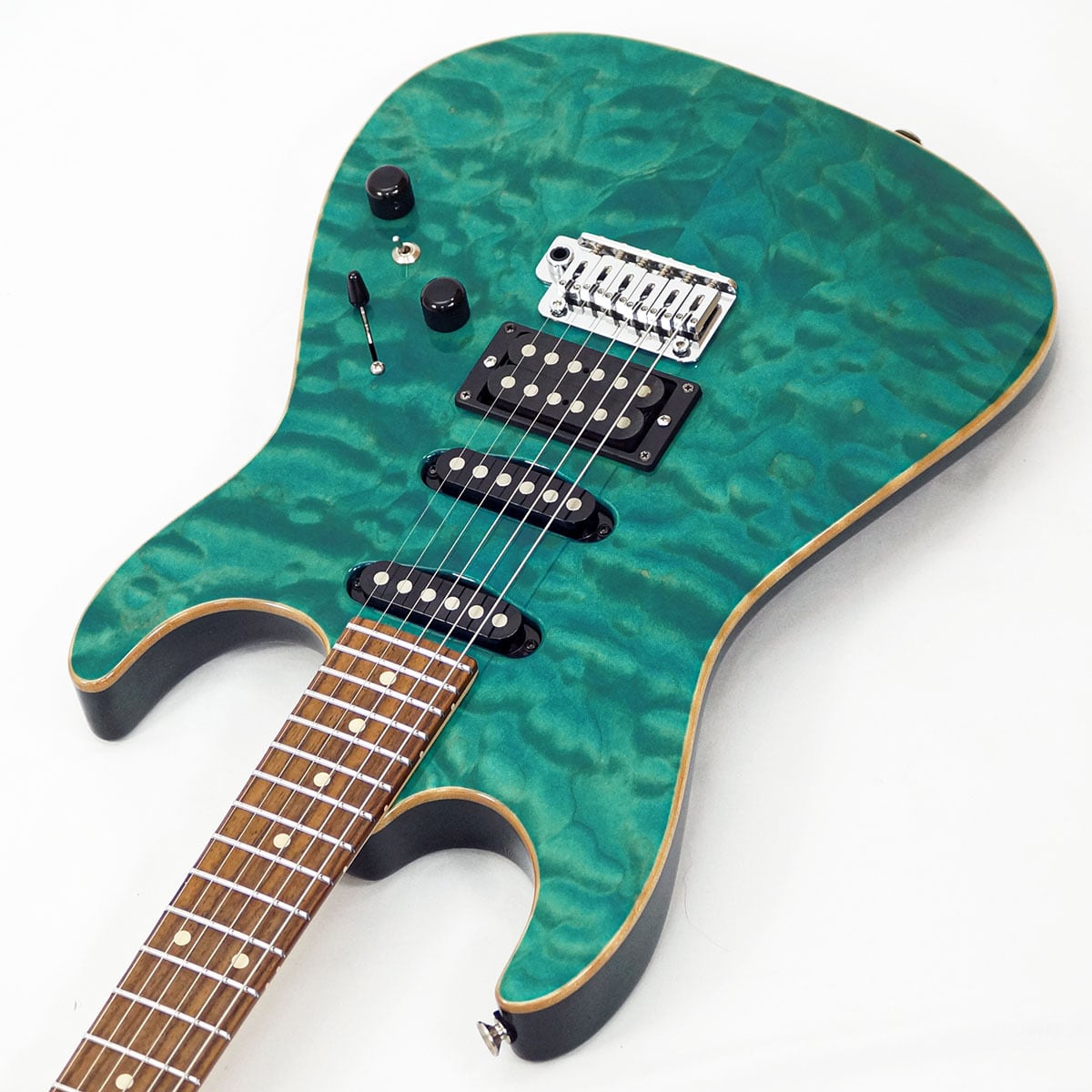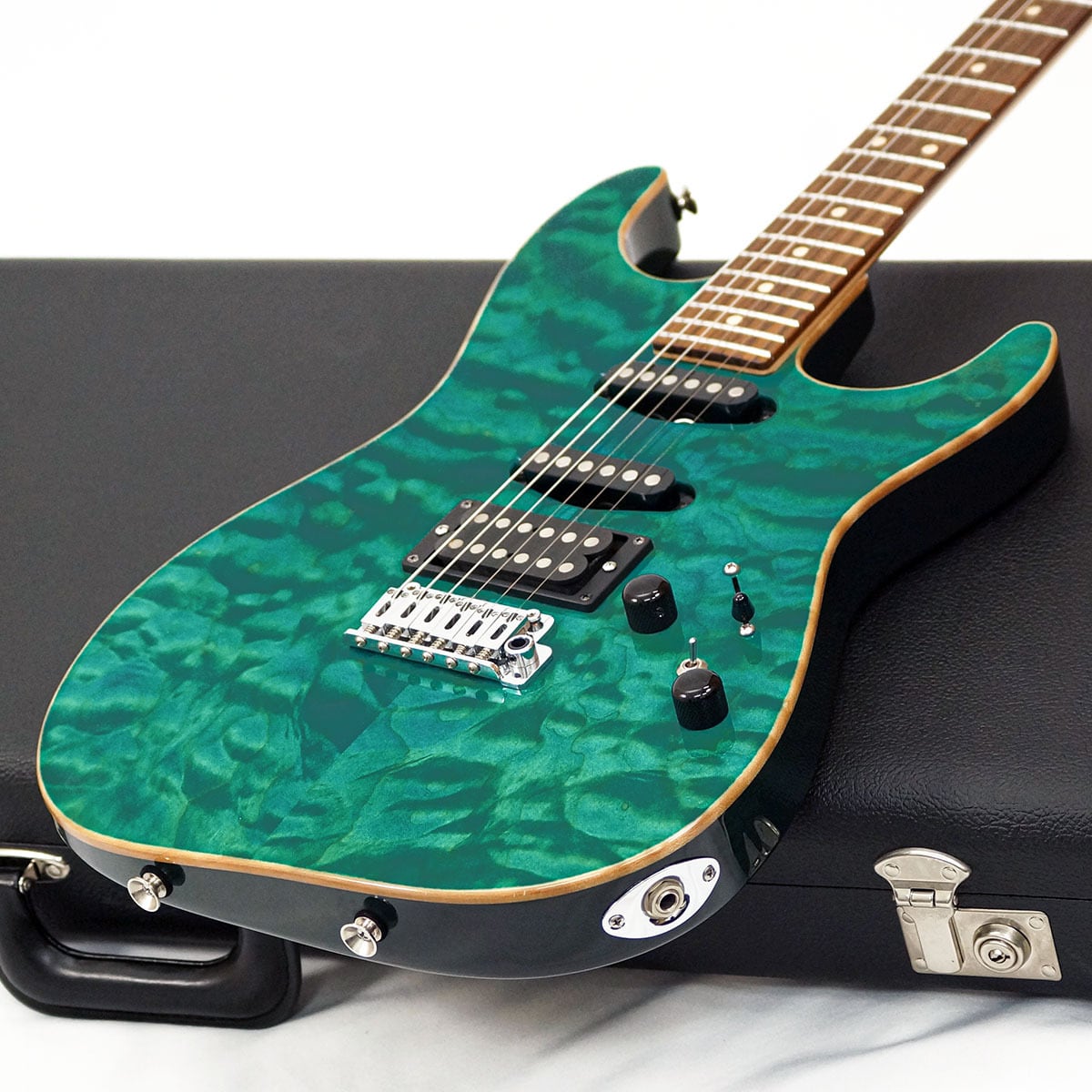 キルト・メイプル/マホガニーBODYにS-S-Hピックアップ配列(SC1 SC1 H2+ Pickups)を採用し、Bora Bora Blueのマッチングヘッドで仕上げた、非常に人気の高い仕様になっています。バズフェイトン チューニングシステムも採用し、確かなピッチ感と、クリアで濁りの無い和音を実現してくれます。