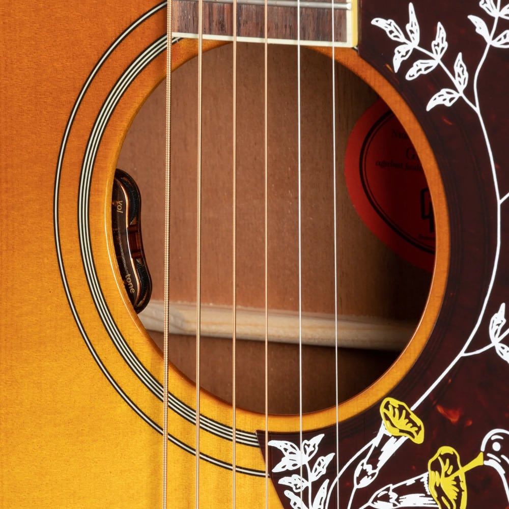 キーストーン・チューナー、ダブル・アンティーク処理が施されたヴィンテージの質感が香るバインディング、Hummingbirdと刻印されたトラスロッドカヴァー、ボーンナット、ボーンサドル等の仕様を纏いつつ、LR Baggs® VTCエレクトロニクスも搭載しており、ライブに宅録にと幅広く活躍できる一本に仕上がっています。