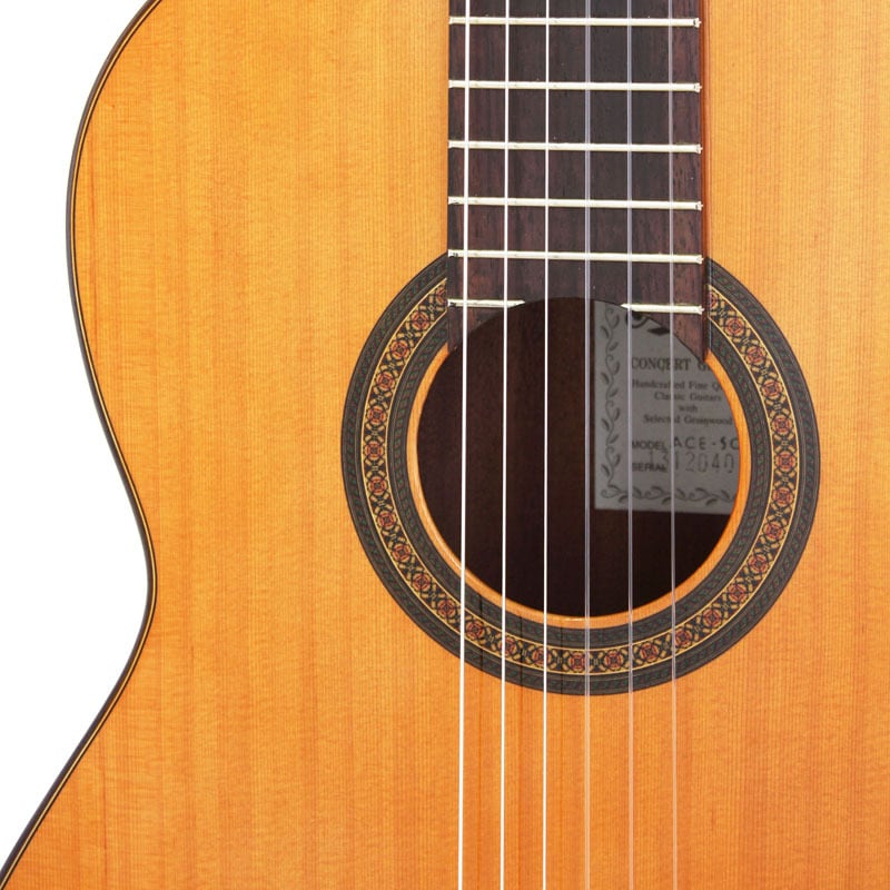 アリアのクラシックギター「ACE-5C」を特別価格にてご用意いたしました!シダー単板トップに、サペリ・サイド&バックを採用。ギター製作技術の伝統を誇るスペインで委託製作され、バインディングや飾り部分には一切プラスチックを使用せず、高級手工ギターと同じように木象眼(モザイク)を使用しています。スペイン製ギターが持つ特有の明るい音色をお楽しみください。