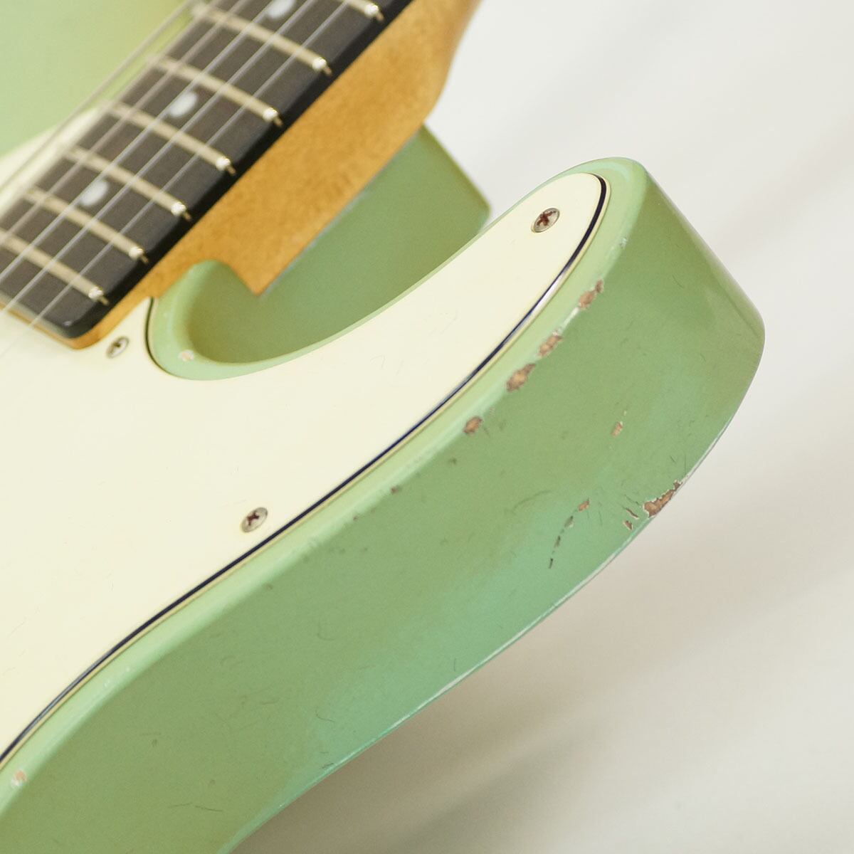 本機は、アルダー・ボディにニトロセルロースラッカーによるサーフ・グリーン・フィニッシュを纏い、程良く弾き込まれた風合いを再現したミディアム・エイジング加工が施されています。