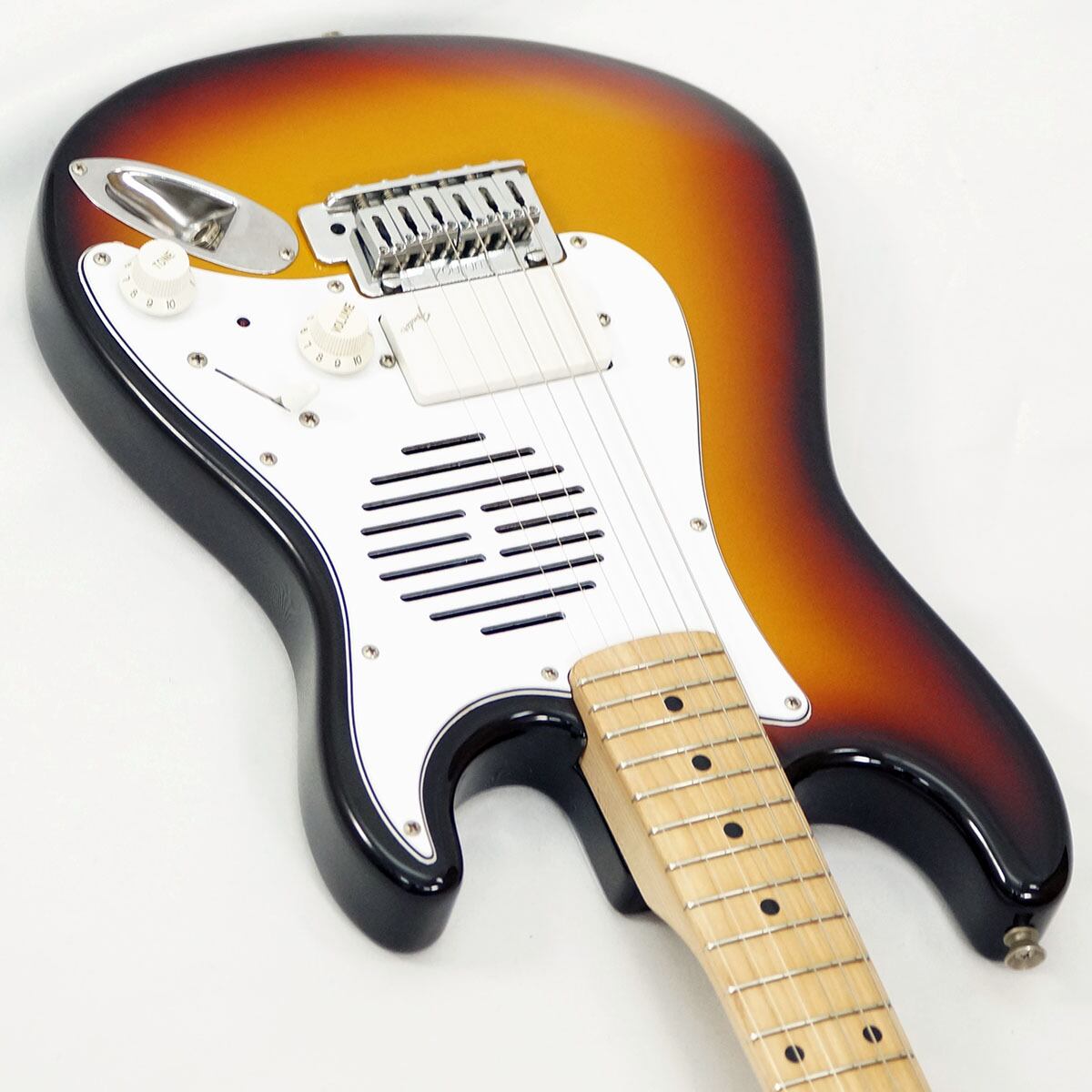 こちらは1990年代製と考えられる個体で、バスウッド・ボディーにメイプル・ネック&ローズウッド指板、3トーン・サンバースト・カラーを採用しています。アンプ&スピーカー内蔵のミニギターとして人気を博したモデルで、3WAYスイッチによって「OFF/ON/ディストーション」の切り替えが可能。305ショートスケールに10ピッチ.・サドルを装備した快適な操作性も魅力です。