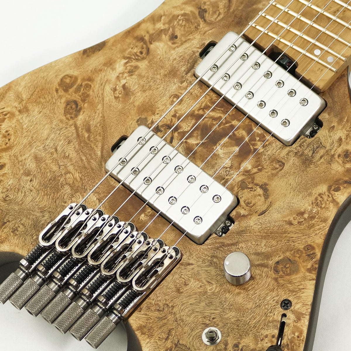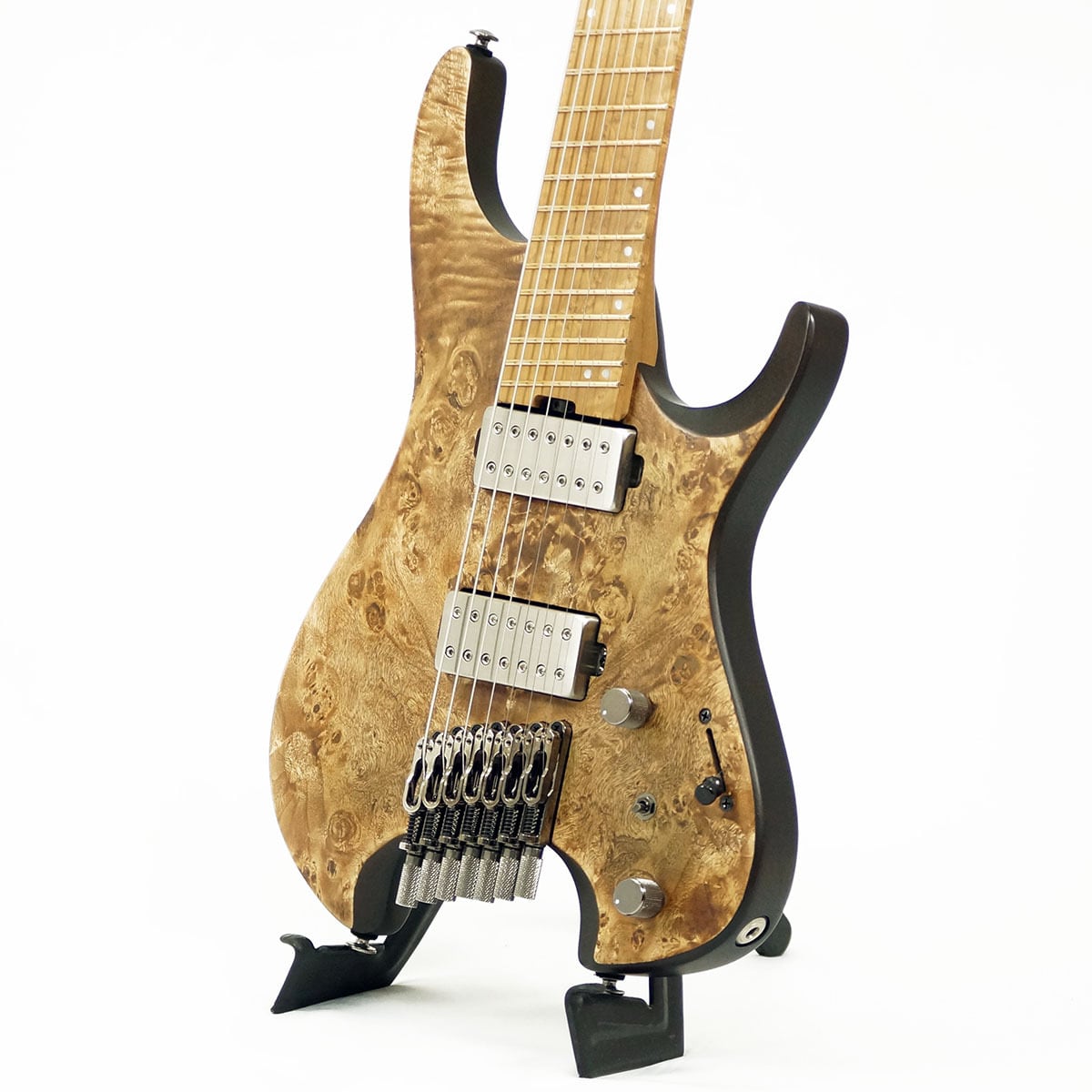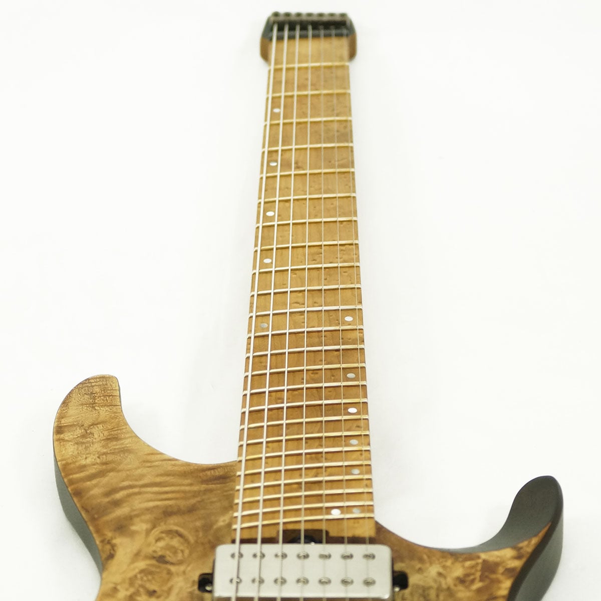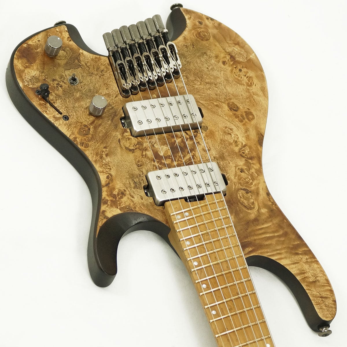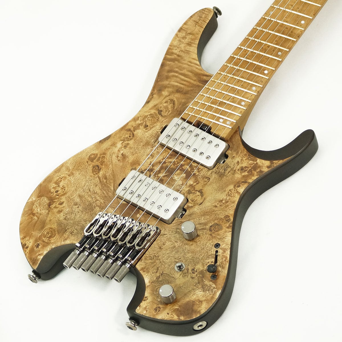 エキゾチックな杢目が印象的なポプラ・バールをボディートップに配した高級感溢れる 7弦ギター です。ボディバックには温かな中低音域成分を特長とするオクメ材を採用し、Qシリーズ7弦モデルのために設計したハムバッカー・ピックアップ"Q58-7"と相俟って、低域は濁らずパワフルで、高域はクリアでありながらもまろやかなサウンドを特長としています。