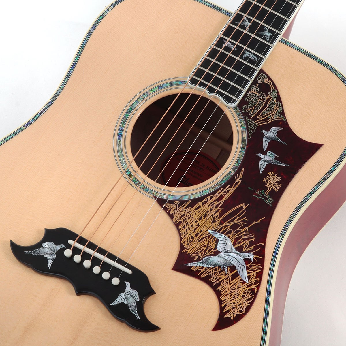 28羽分のエングレーヴされたダヴ(鳩)のインレイが埋め込まれています。ヘッドストック上に7羽、指板上に16羽、ピックガード上に3羽、そしてブリッジベース上に2羽であり、それぞれが別々の表情をしている点が魅力です。