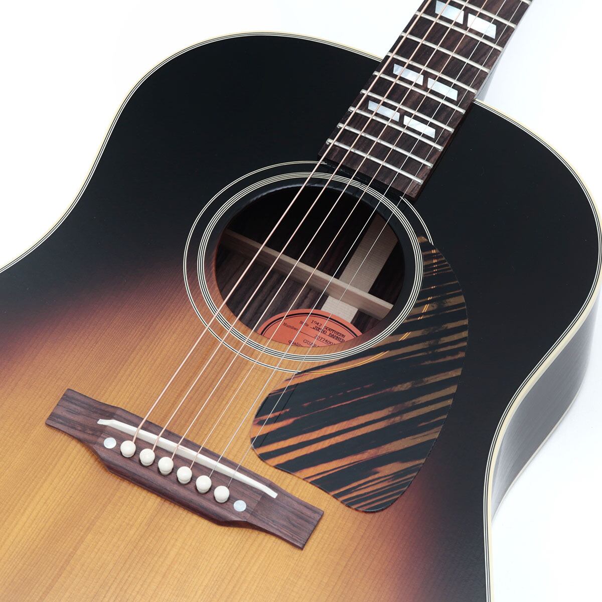 何気なく第一ポジションのコードを爪弾いたりブルーズの定石フレーズを弾くだけで、サザン・ジャンボの汎用性の高さをご納得いただけるでしょう。ヘッドストック上で“Only a Gibson is Good Enough”と書かれたバナーを誇らしく掲げつつ、オープン・スロット・ブリッジ、ボーン・サドル(ナット)、1.77インチと幅広なナット幅など、往年の仕様の数々が採用されており、本モデルの魅力が一層高められています。