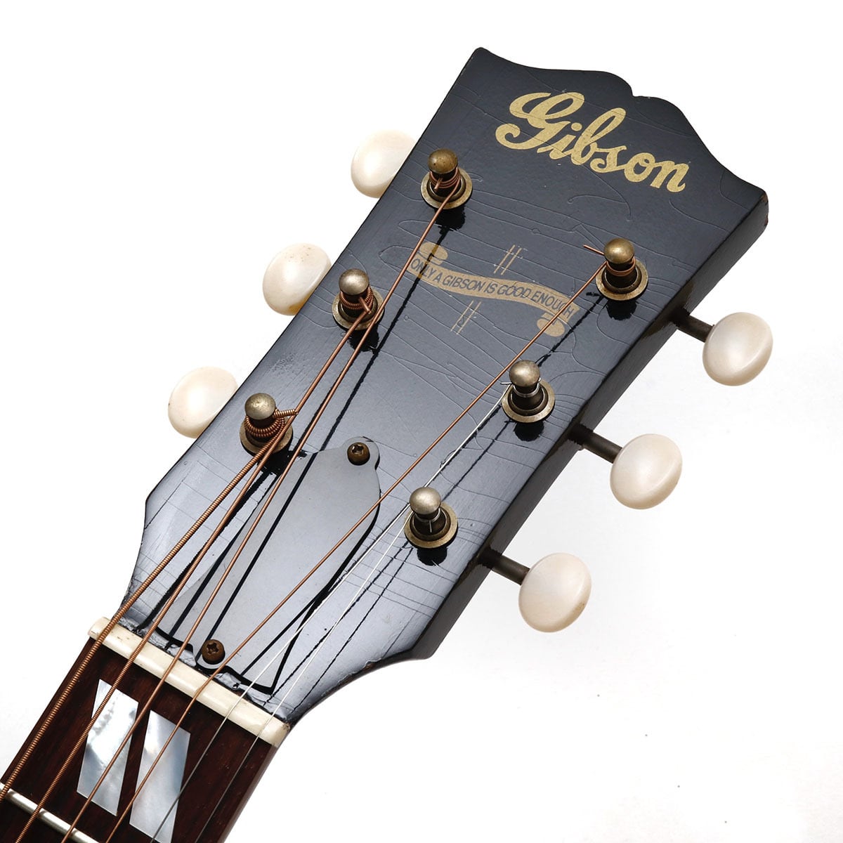 何気なく第一ポジションのコードを爪弾いたりブルーズの定石フレーズを弾くだけで、サザン・ジャンボの汎用性の高さをご納得いただけるでしょう。ヘッドストック上で “Only a Gibson is Good Enough” と書かれたバナーを誇らしく掲げつつ、オープン・スロット・ブリッジ、ボーン・サドル(ナット)、1.77 インチと幅広なナット幅など、往年の仕様の数々が採用されており、本モデルの魅力が一層高められています。