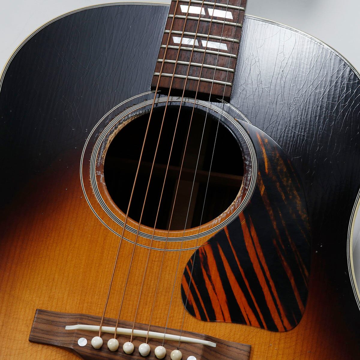 Custom Shop Murphy Lab 1942 Banner Southern Jumbo には、マーフィー・ラボの熟練ルシアー達によるライトエイジド仕上げが施されています。マーフィー・ラボによるライト・エイジド・フィニッシュは、エイジング処理されたハードウェアとともに、数十年にわたりギタリスト達に演奏され続けてきたヴィンテージギターの風合いを再現しています。ギブソン黄金期のオリジナル・モデルならではの個性、雰囲気、フィーリングが感じられる仕上がりとなります。